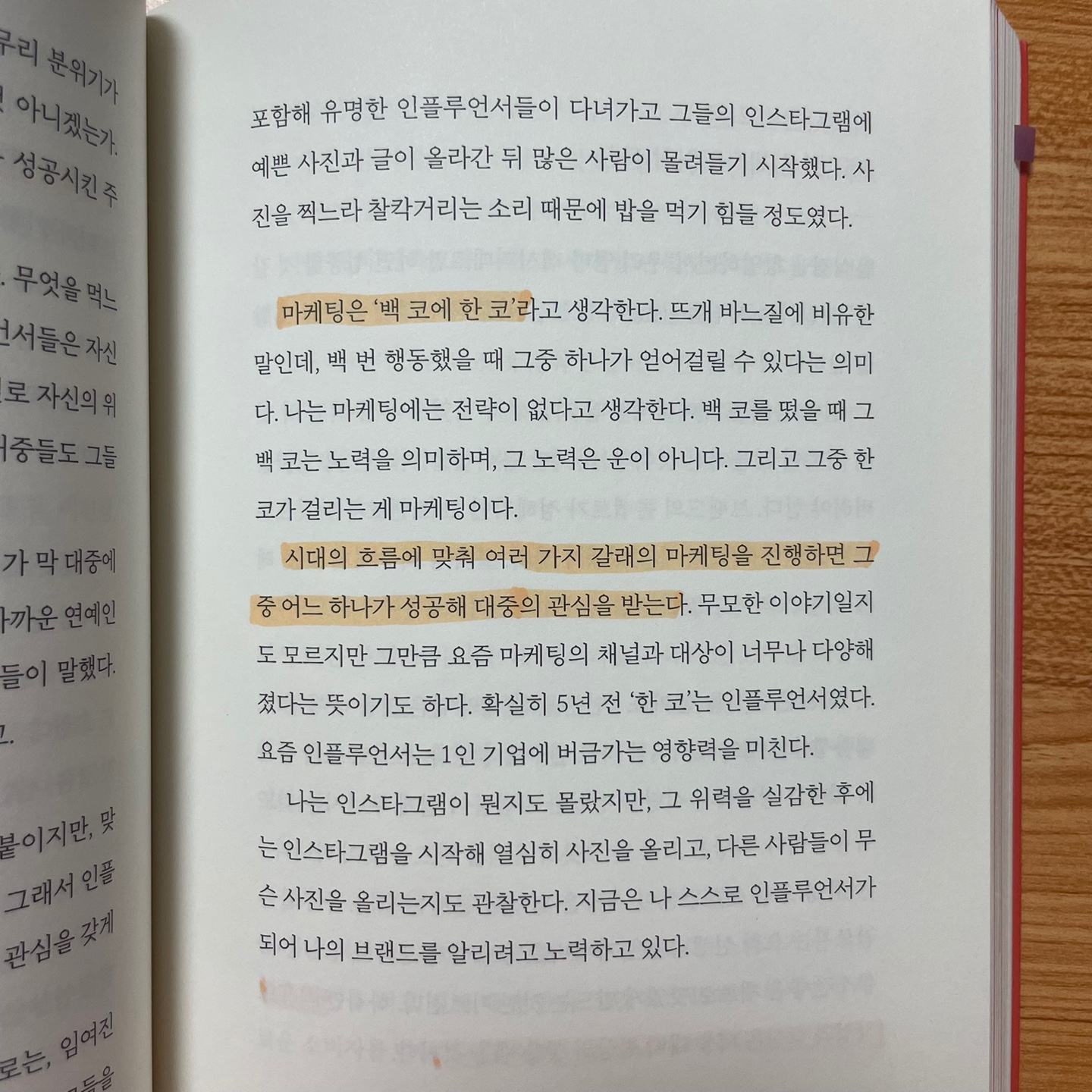 학교에서 마케팅 수업을 처음 듣고 마케팅의 매력에 빠져들었다. 합정 알라딘에 가서 마케팅 책들을 기웃거리다가 우연히 손에 집혀 읽게 되었는데 너무 흥미롭고 재밌었다. 이 책을 읽기 전엔 유럽에서 초밥 사업으로 대성하신 켈리 최님의 [파리에서 도시락을 파는 여자]라는 책을 읽었는데 마케팅과 관련된 전체적인 맥락이 비슷하다는 생각이 들었다. 그래서 이 두 책을 같이 읽어보는 것도 추천한다.
