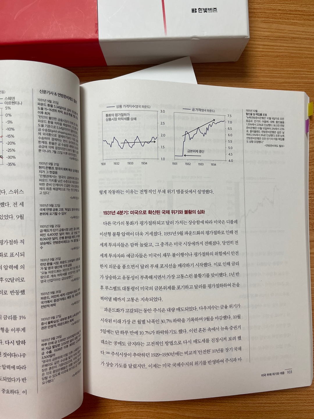 파트2는 위의 사진에서 알 수 있듯이 '금융 위기의 상징적인 사례 연구'이다. 시간대별로 어마어마한 금융위기의 사례들로 책 내용이 구성되어있으며 페이지 오른쪽에는 작은 글씨로 그 당시의 신문 기사들이 발췌되어있다. 이 기사 내용들 덕분에 금융 위기 당시의 심각한 상황을 더 실감나게 느낄 수 있었다.