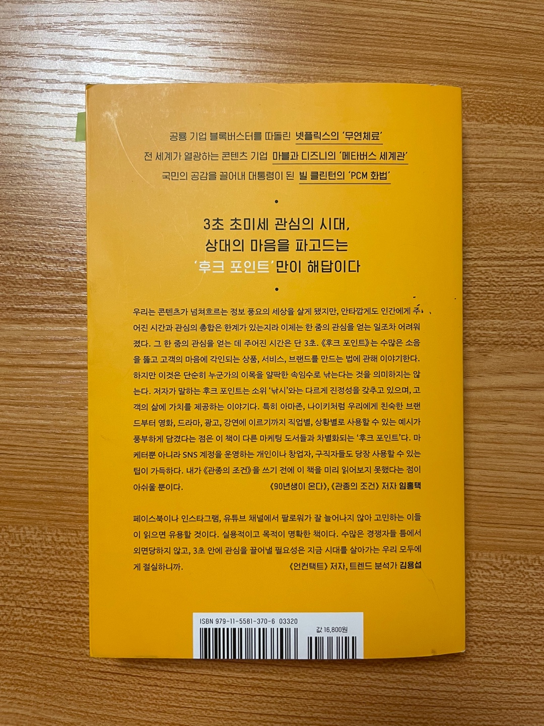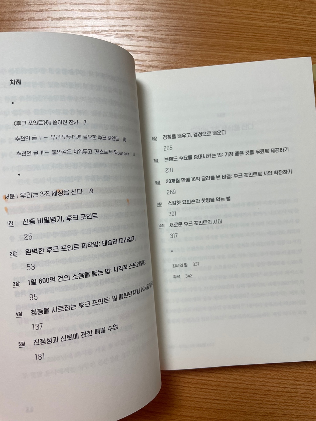 : 저자는 ‘3초’를 강조한다. 온갖 잡음이 가득한 세상에서 사람들이 한 콘텐츠에 반응하는 시간은 단 ‘3초’라는 것이다. 이 책의 이름 <<후크포인트>> 또한 ‘3초 정도의 짧은 시간 안에 사람들의 관심을 후크hook하는 포인트’를 의미하며, 책에선 이 후크포인트를 만드는 방법론에 집중한다.