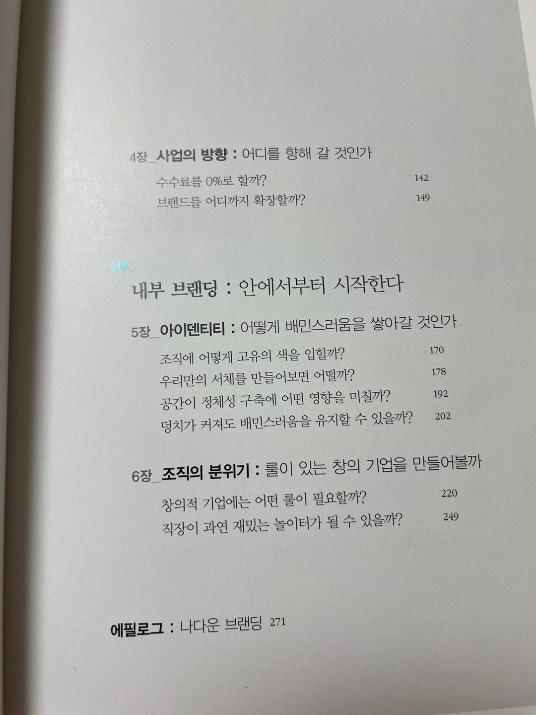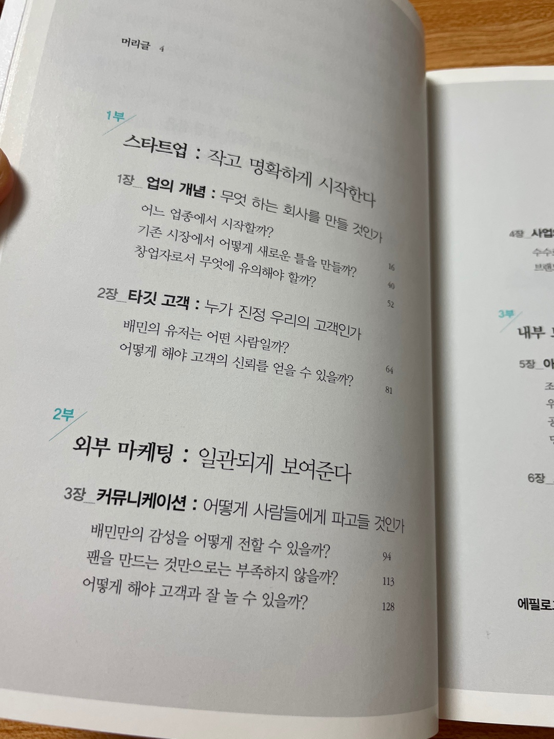 1,2,3부로 나누어져 있다. 1부는 ‘스타트업’, 2부는 ‘외부마케팅’, 3부는 ‘내부 브랜딩’이 주제다.