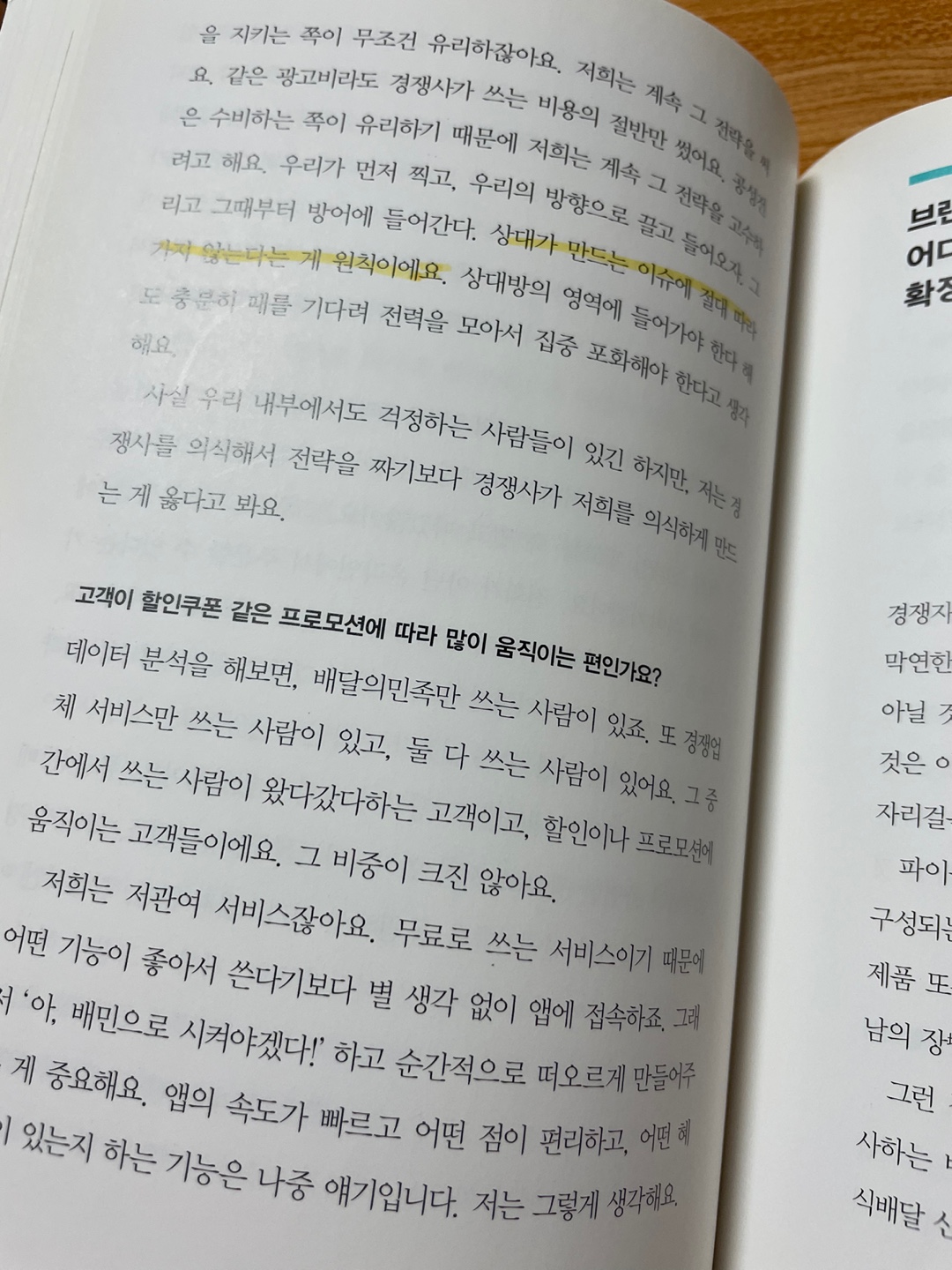 이 책은 마케팅 전문가인 홍성태라는 분이 마케팅을 잘하기로 소문난 기업 배달의 민족의 사장 김봉진 님을 인터뷰한 내용을 책으로 쓴 책이다. ‘인터뷰’라고 해서 잡지처럼 사진이 대부분이고 그 사람의 개인적인 내용 위주로 나타낸 것이라고 생각할 수도 있는데 전혀 아니다.