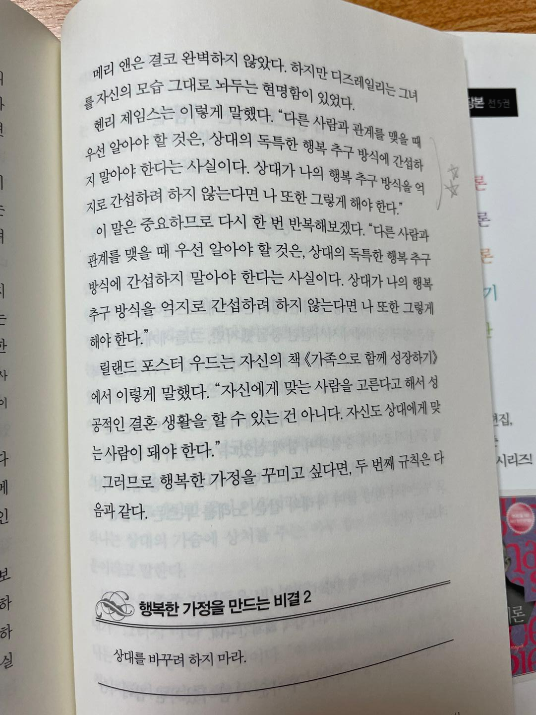 "다른 사람과 관계를 맺을 때 우선 알아야 할 것은, 상대의 독특한 행복 추구 방식에 간섭하지 말하야 한다는 사실이다. 상대가 나의 행복 추구 방식을 억지로 간섭하려 하지 않는다면 나 또한 그렇게 해야한다. "