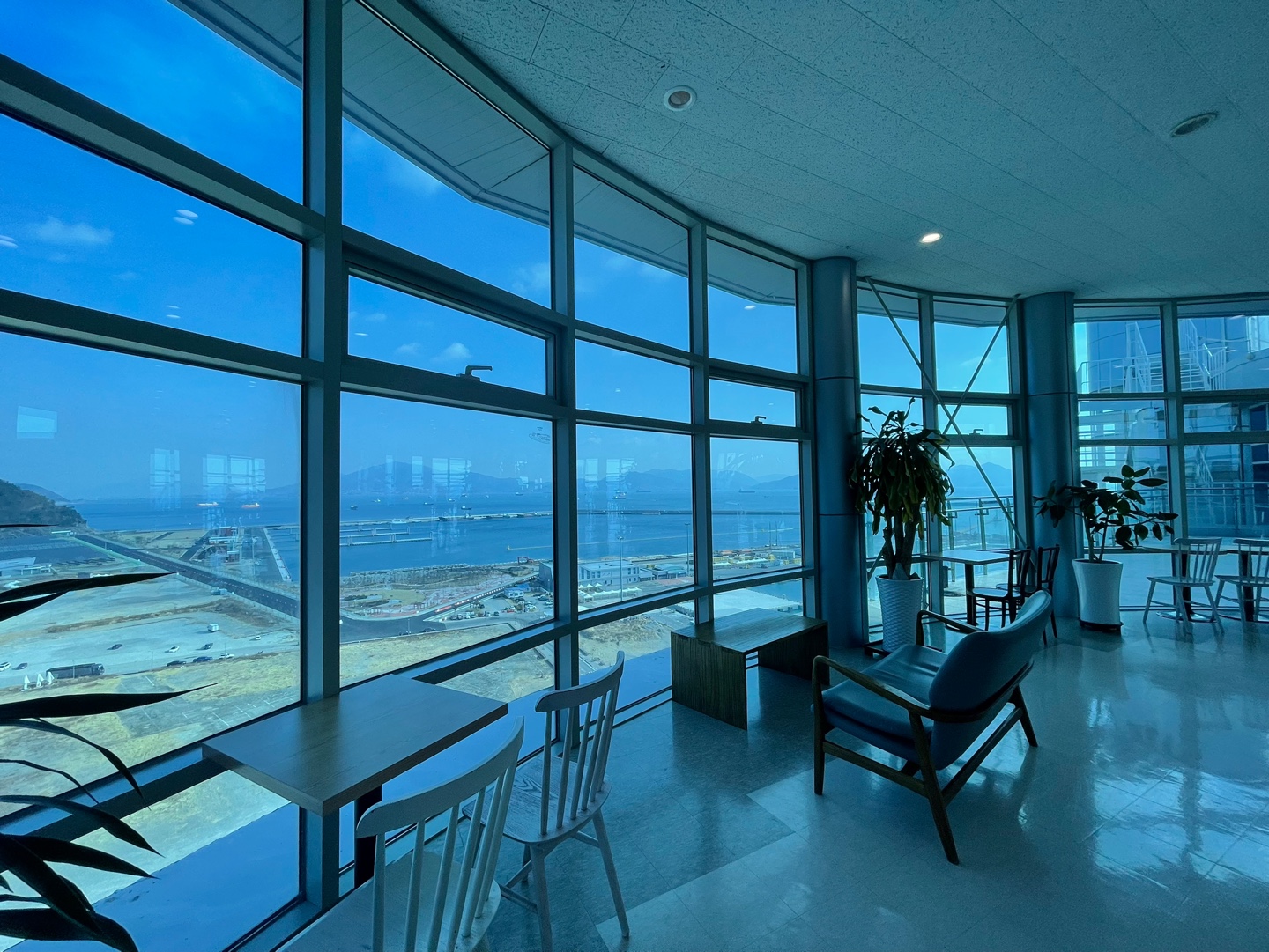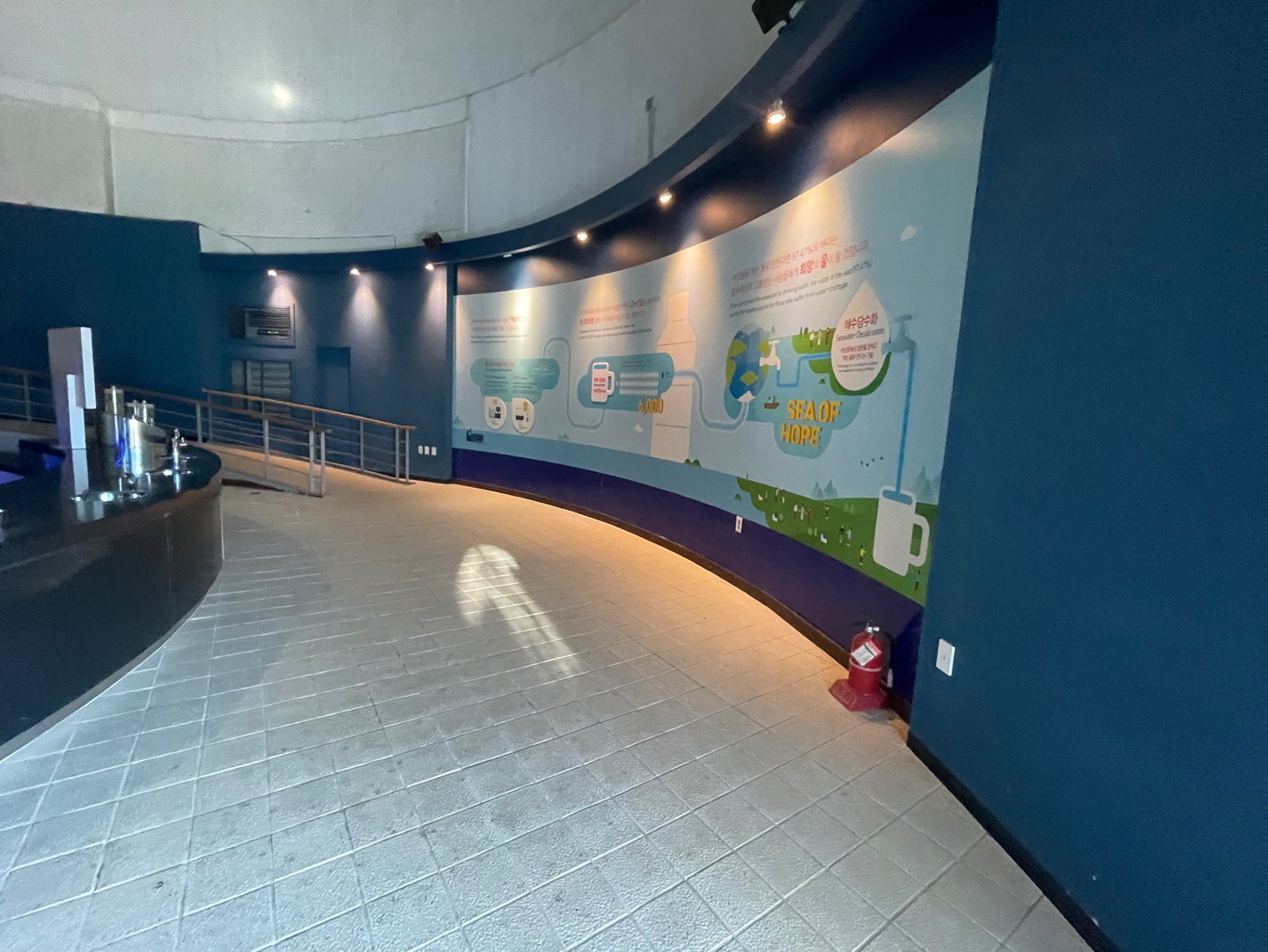 여기는 엄청 높은데 1층과 꼭대기층 딱 두개의 층으로 되어있다. 1층은 벽 설명 읽어보며 '이렇게 마시는 물이 만들어지는 구나~' 하고 깨알 지식을 습득할 수 있었다. 꼭대기층은 바다뷰 맛집이다. 여기서 여수 쑥으로 만들었다길래 뭔가 여행지만의 특산품 느낌나서 한번 여수 쑥빵을 먹어봤는데 생각보다 맛있었다! 빵을 따뜻하게 데워주셔서 더 맛있게 느껴진 것 같다.