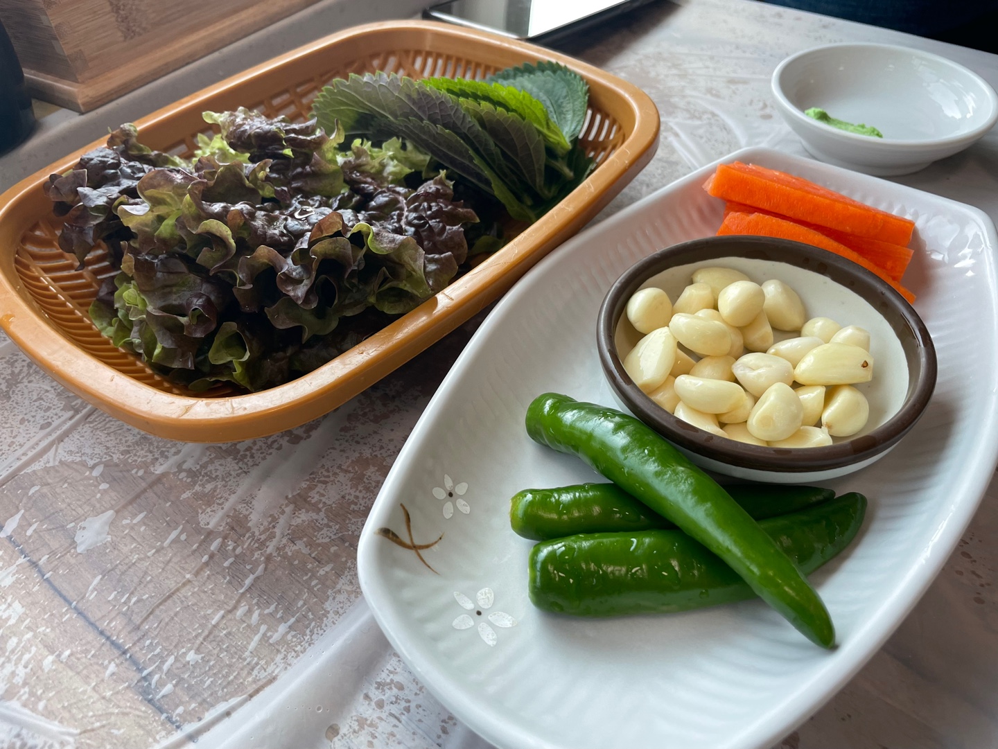1인당 4,000원짜리 상차림이다. 마늘 부족해서 더 달라고 부탁드렸더니 추가 비용 없이 더 주셨다!